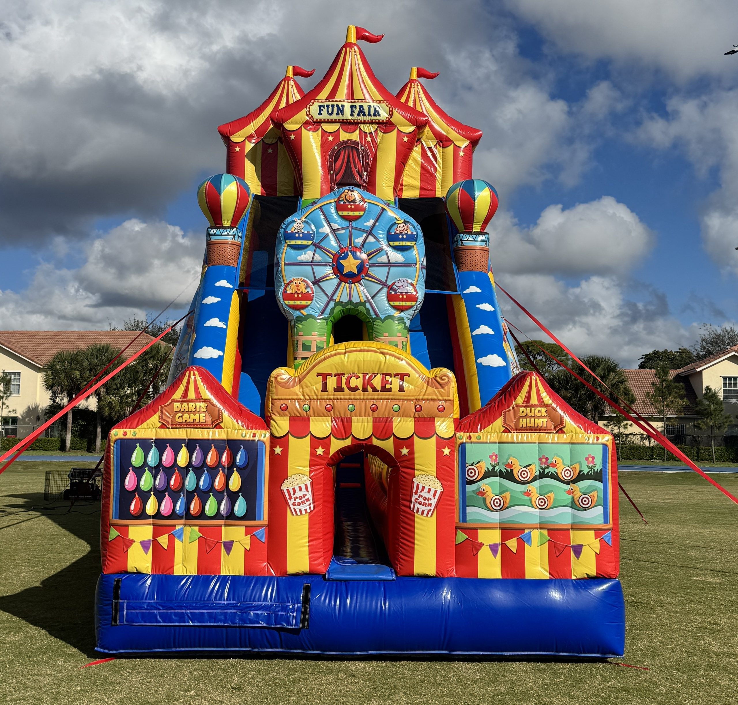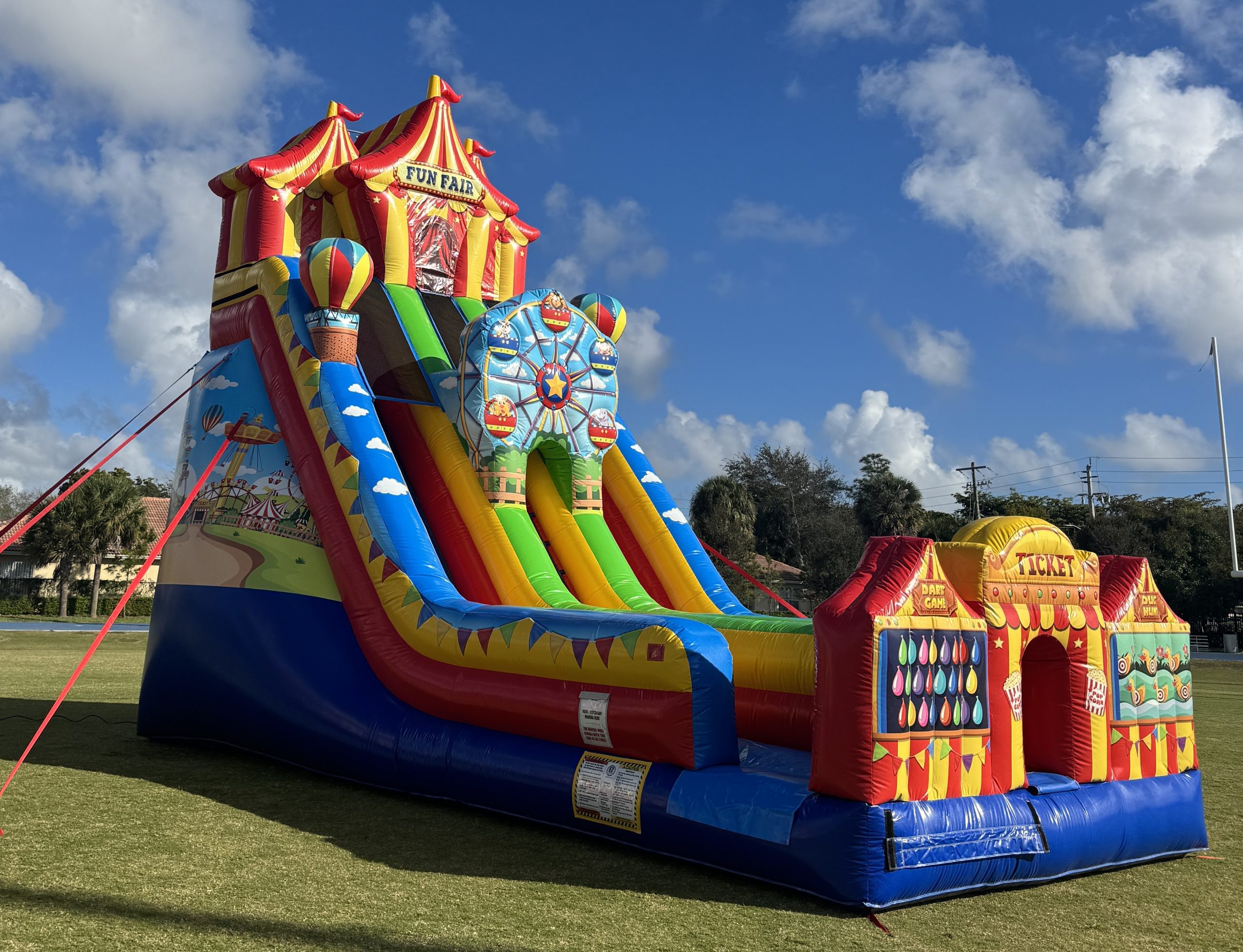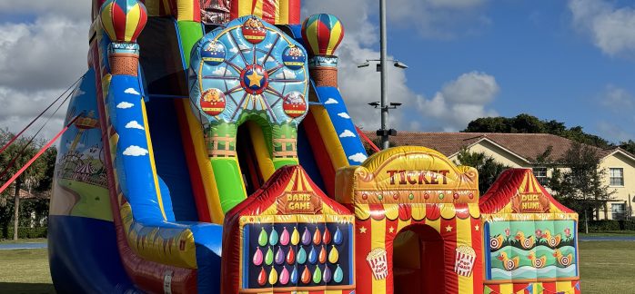 Bring the excitement of the midway to your next event with our 26′ Carnival Themed Dry Slide, one of South Florida’s most eye-catching and thrilling inflatable attractions! Perfect for school carnivals, church events, corporate parties, birthdays, and neighborhood block parties, this giant slide delivers nonstop fun for all ages. Featuring bold carnival colors, fun graphics, and a steep, fast sliding lane, this dry slide is guaranteed to draw a crowd and keep guests entertained for hours.