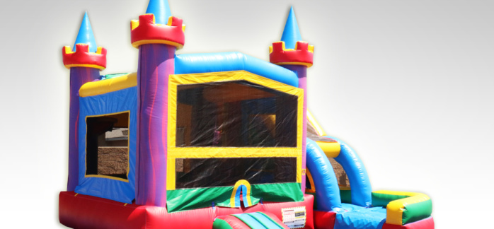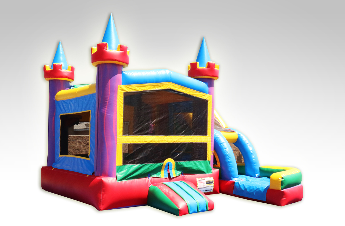 Water Slide with pool…Great colors! You kids can Bounce, Climb, Slide and Shoot Baskets in this over sized colorful combo unit.