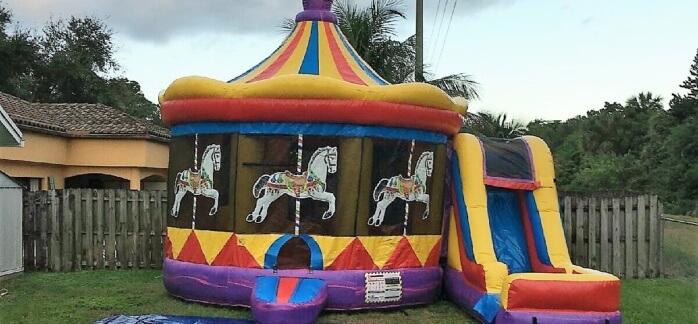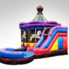 5 activities in 1 ….Bounce, climb, slide, ride horses, shoot basketballs into the hoop! Can also be done WET with a pool!