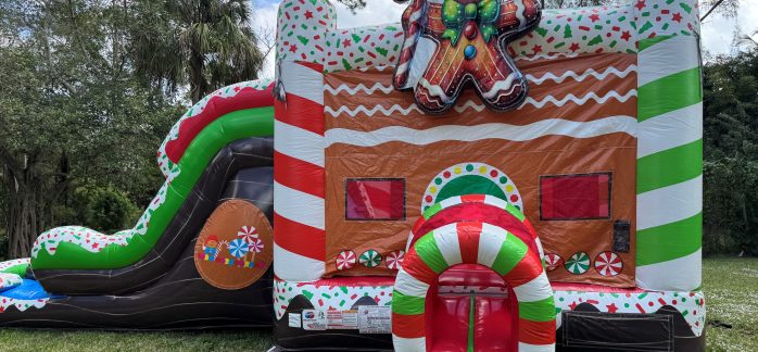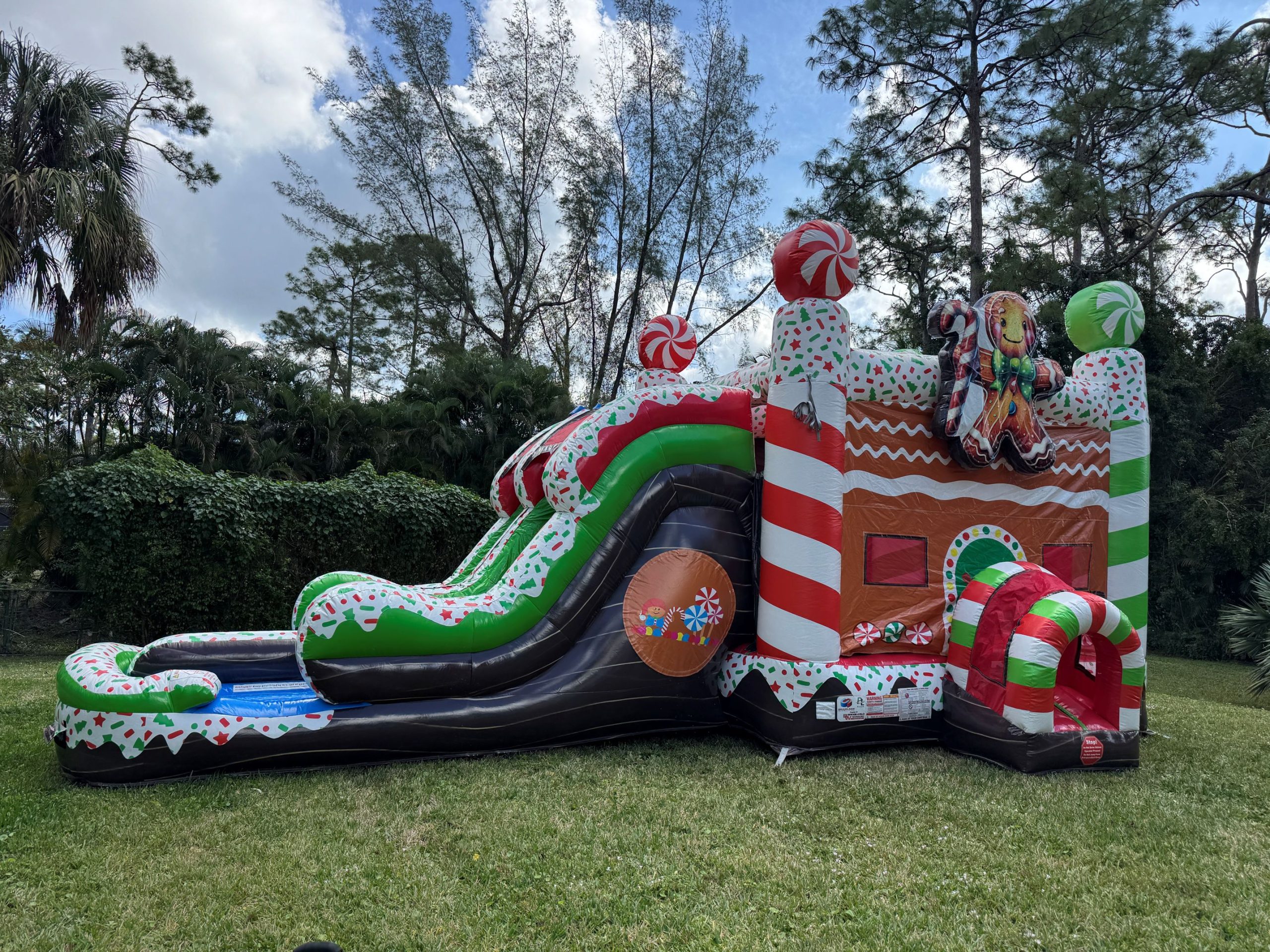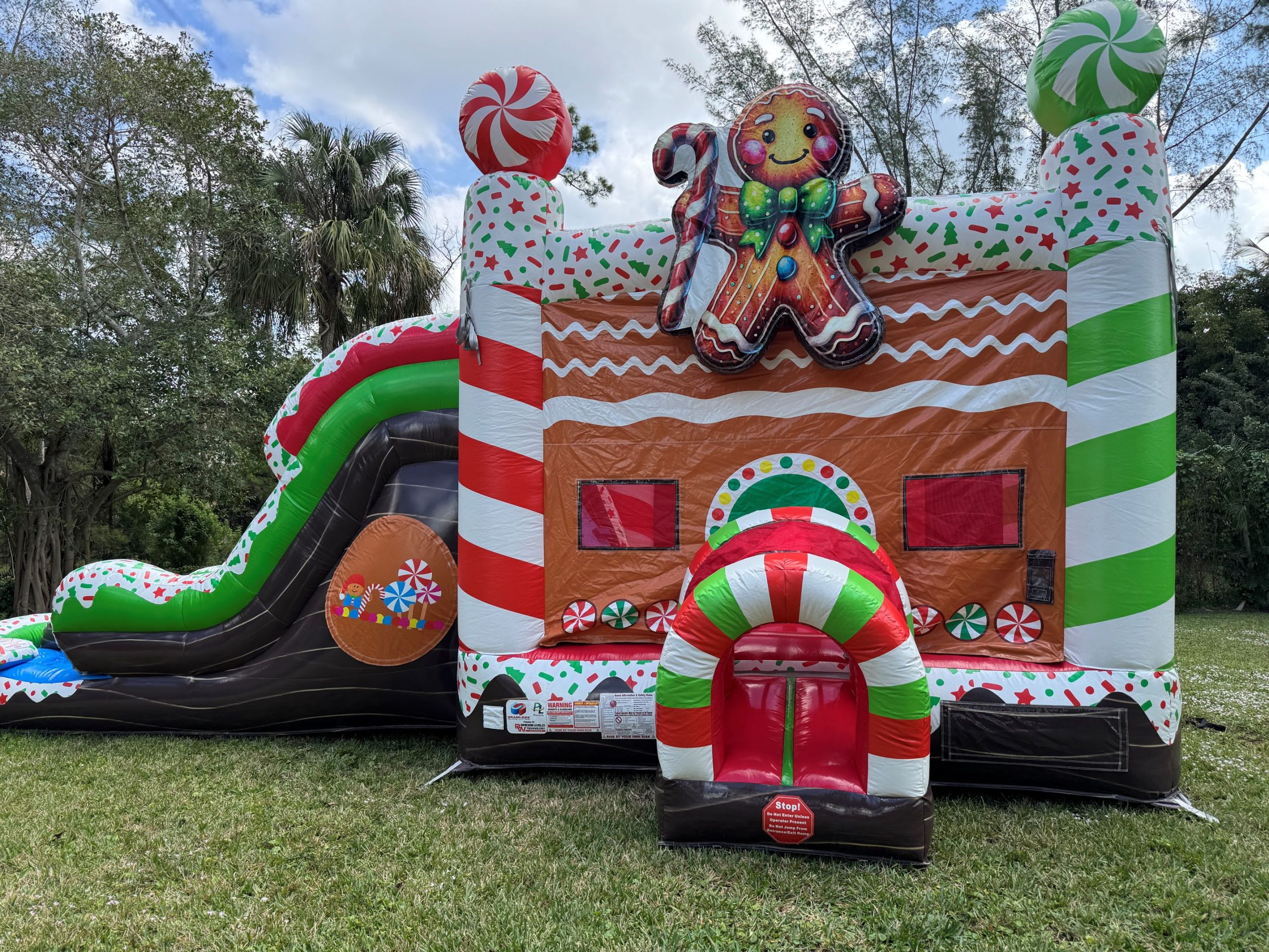 Bring the magic of the holidays to your party with our 5-in-1 Gingerbread Combo, South Florida’s sweetest Christmas-themed inflatable! This festive combo features a spacious bounce area, slide, climbing wall, basketball hoop, and fun obstacles—perfect for schools, churches, winter festivals, backyard parties, and corporate events. The bright gingerbread design creates the ultimate holiday photo backdrop and keeps kids entertained for hours.