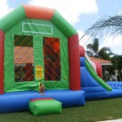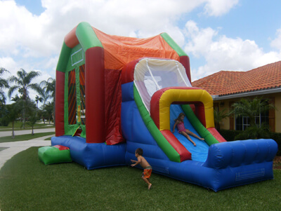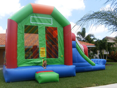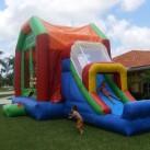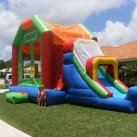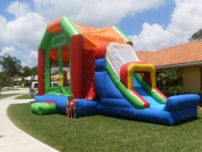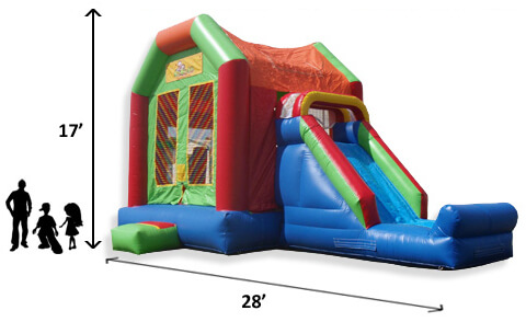 This 5-in-1 combo bounce house draws attention by all kids to stop and romp in this five-activity combo. Designed to fit any theme or event, this bounce house can entertain children of all ages and allow them hours of healthy activity. Entering into the large interior jumping area offers 4 basketball hoops so you can get your game on and have many hours of basketball fun. It also includes both a log and pop-up obstacle course to add more of a challenge and thrill. Then find yourself at the climbing wall only to climb up to the top for find a slick, exciting slide to the end. Parents and spectators are offered a clear view with the mesh sides of this ultimate combo. This 5-in-1 slam dunk is sure to make any event a great success!