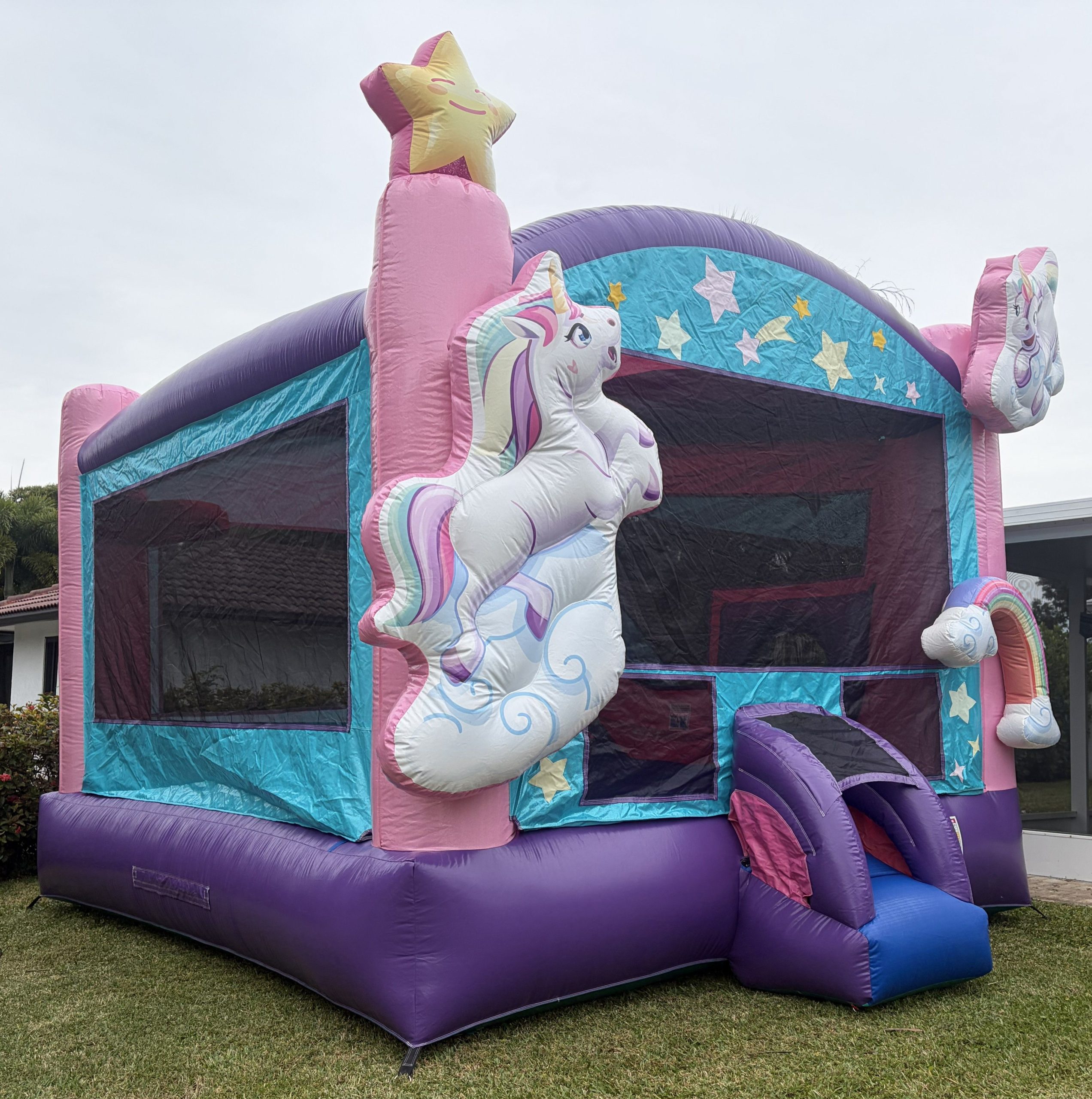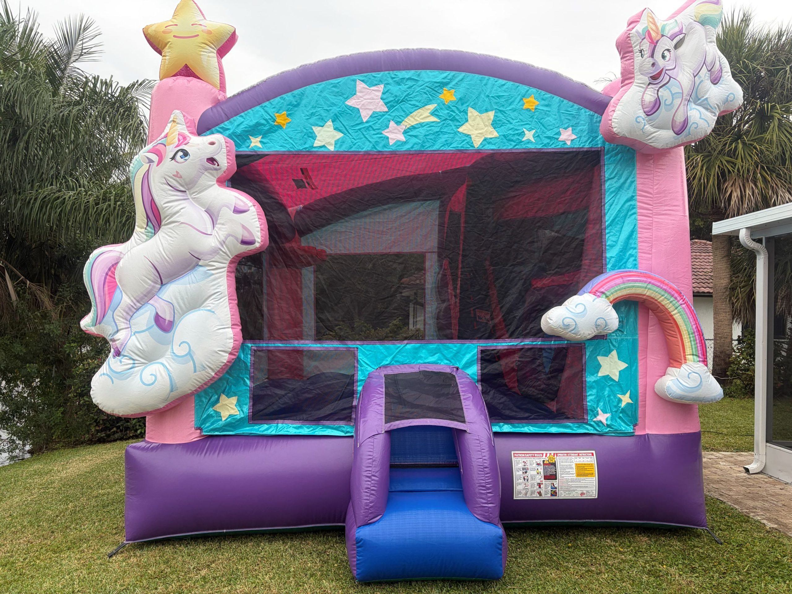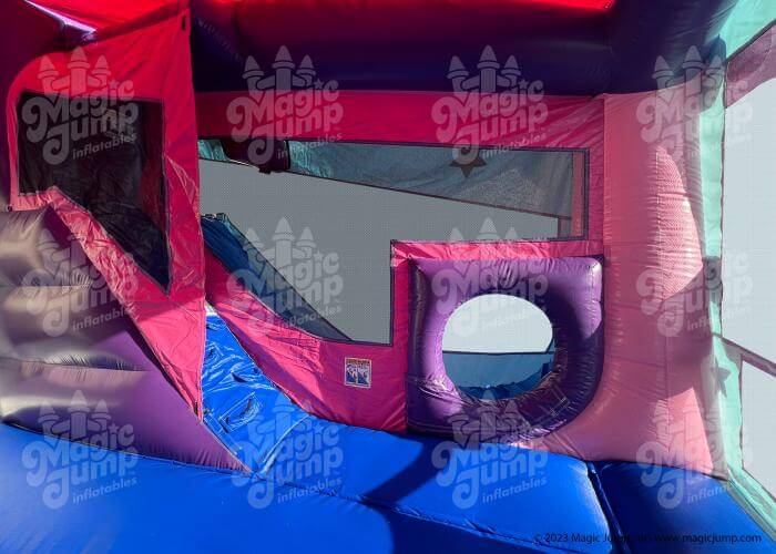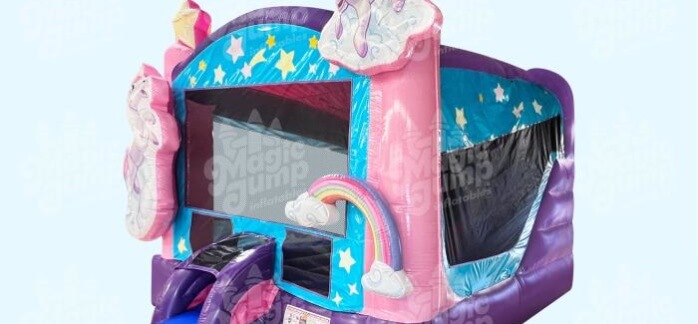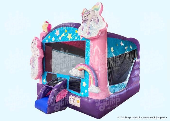Inside the Unicorn Combo, a basketball hoop beckons those looking to showcase their skills, while the ample bounce, climb and slide area have been meticulously crafted with safety in mind. The entire unit is crafted with high-quality, non-slip vinyl, ensuring a safe environment for users to play and easy monitoring through the large mesh windows around the entire unit.