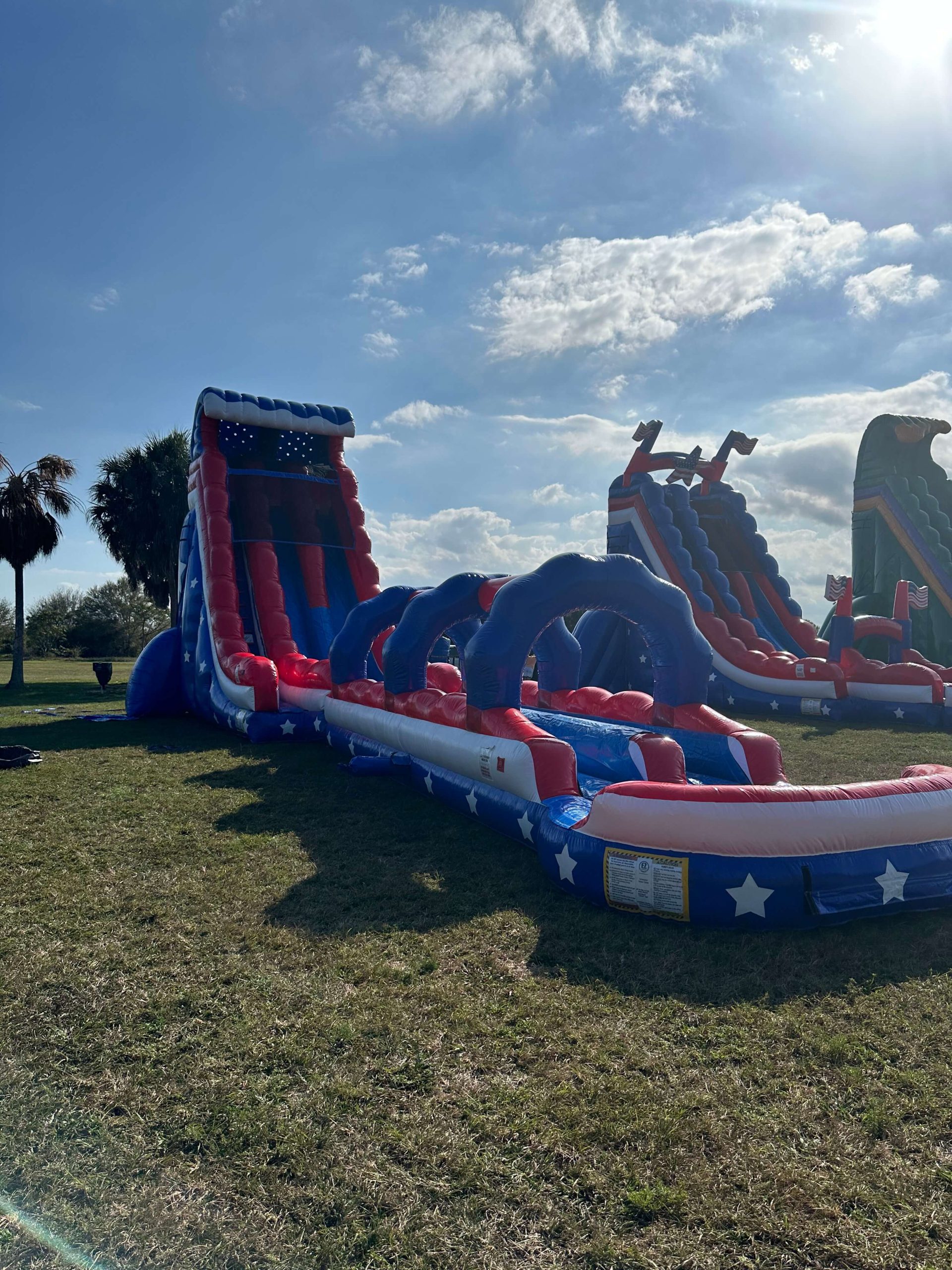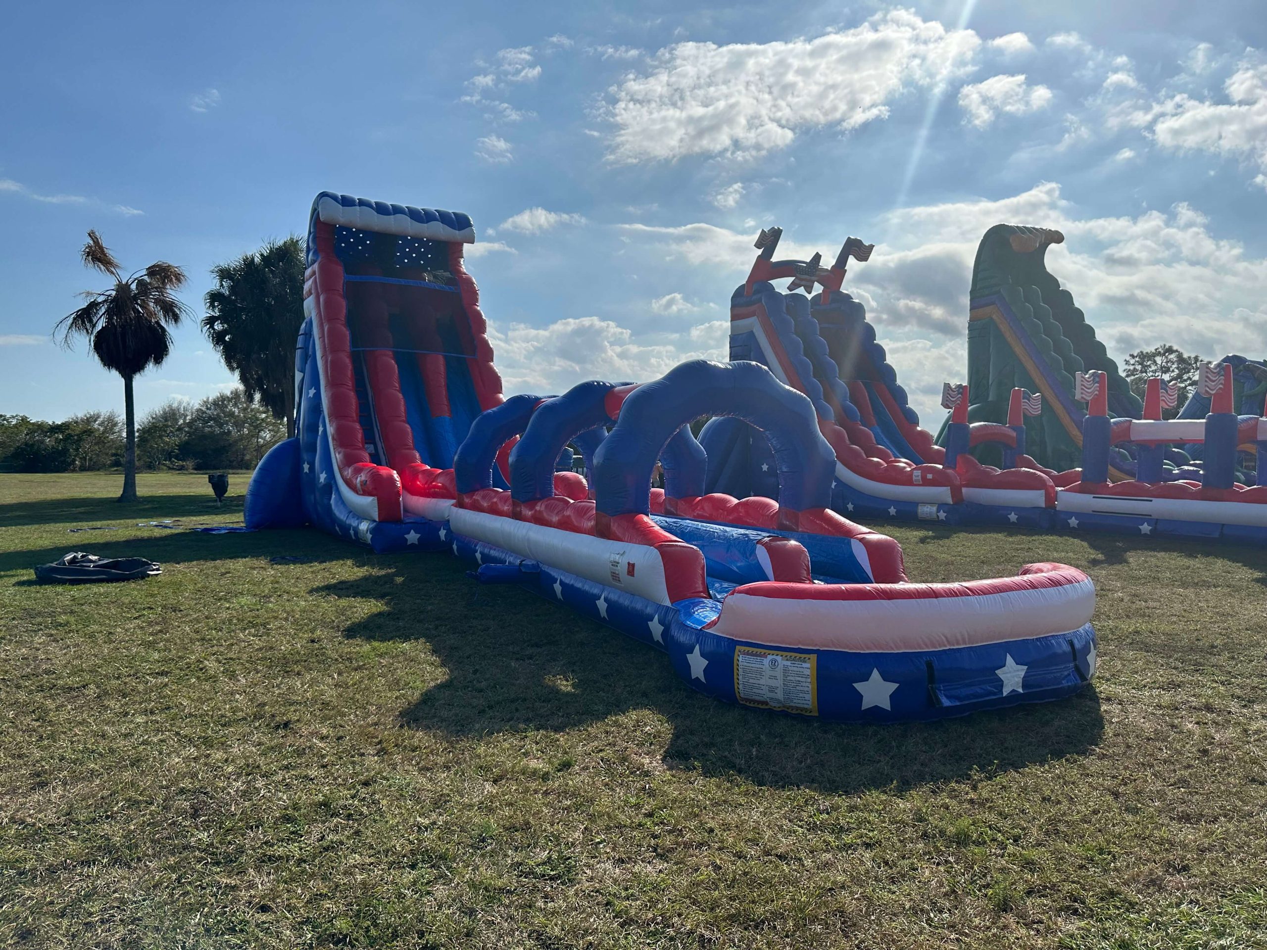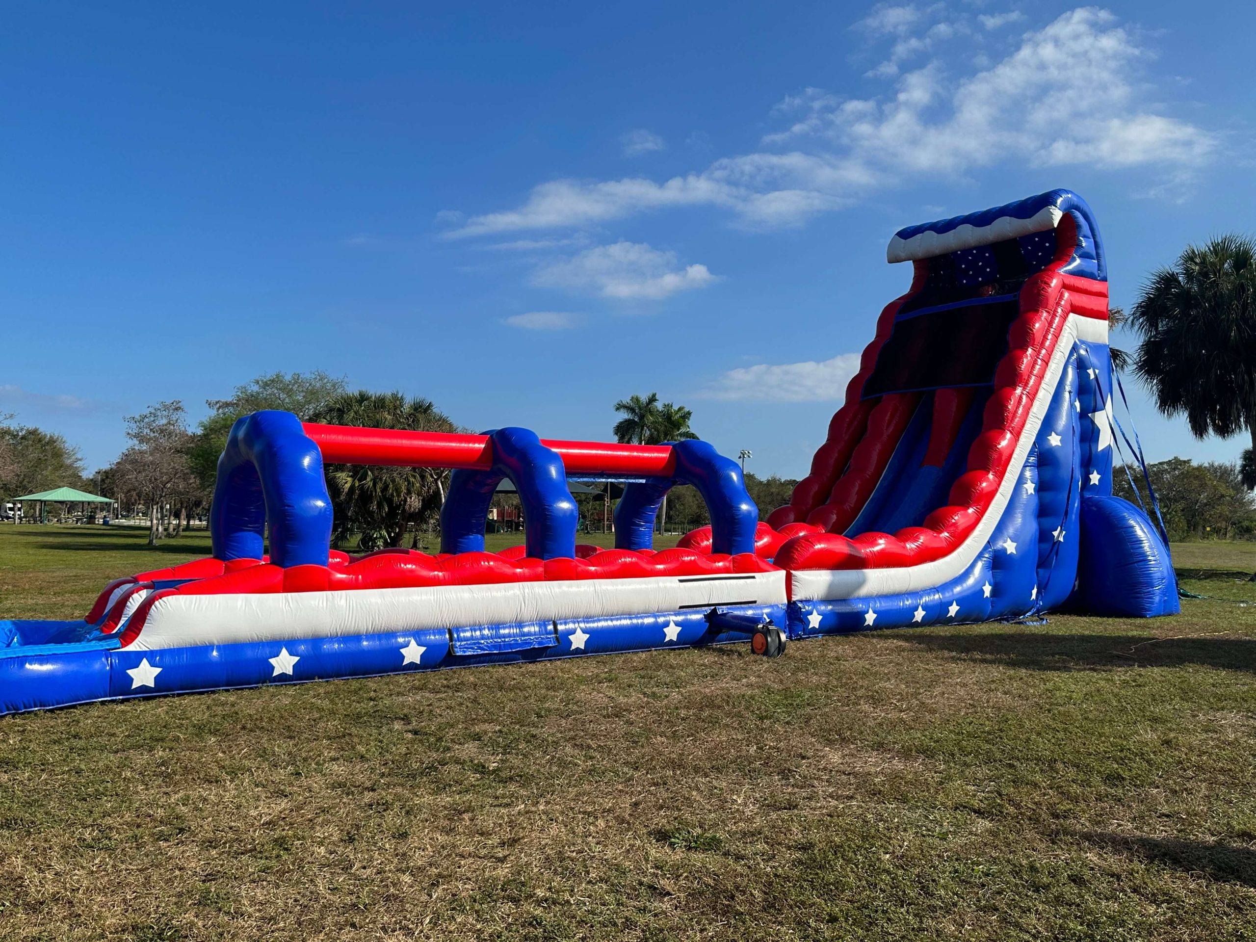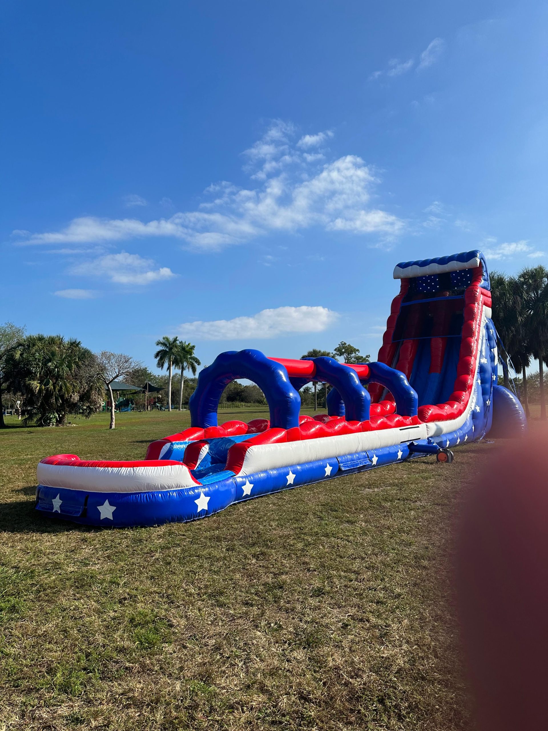 “Experience the thrill of the *All American 30ft Dual Lane Water Slide*—the ultimate rental for parties and events in South Florida! Perfect for kids and adults alike, this towering water slide offers dual lanes for double the fun, making it ideal for races and cool summer vibes. With vibrant patriotic colors, it’s a hit for July 4th celebrations, birthdays, and gatherings in Palm Beach, Broward, and Miami-Dade counties. Safe, exciting, and built for all-day enjoyment, South Florida Bounce and Slide brings the best water slide rental to you. Book today for unforgettable fun!” One of South Florida’s Tallest Slides