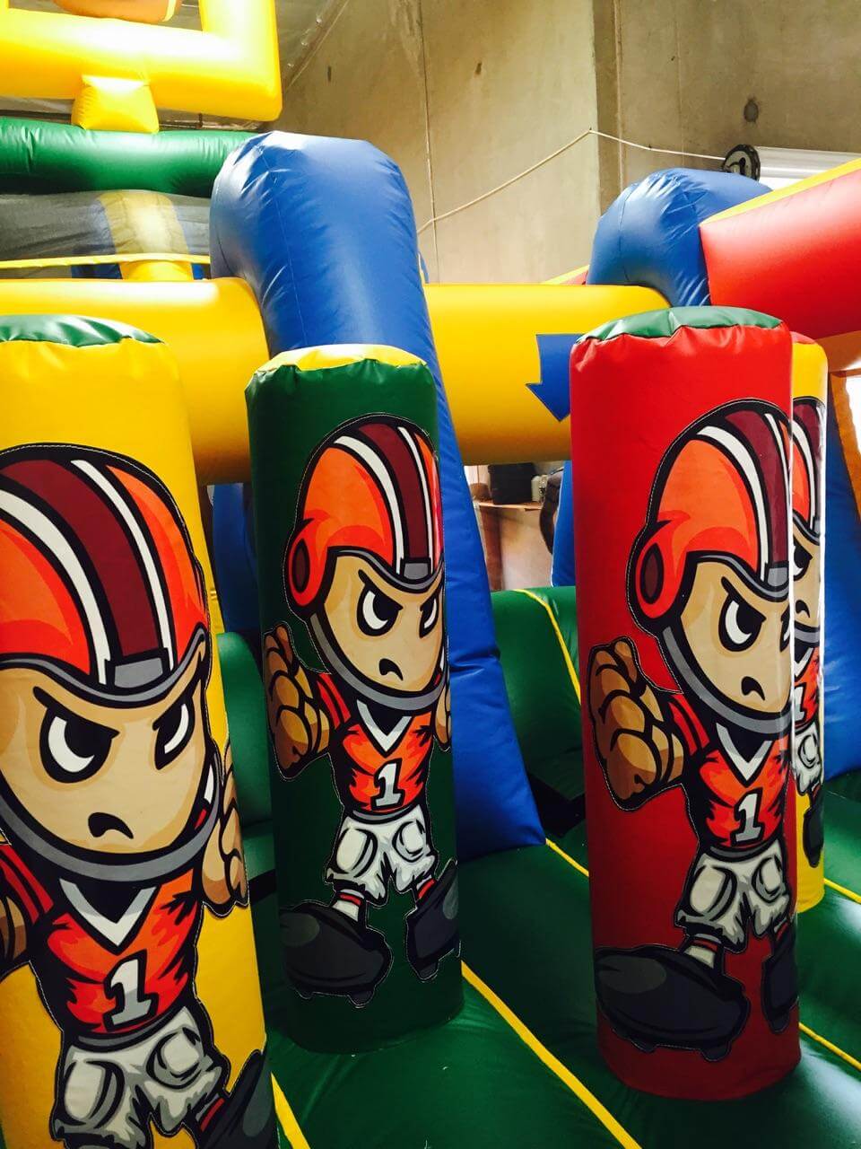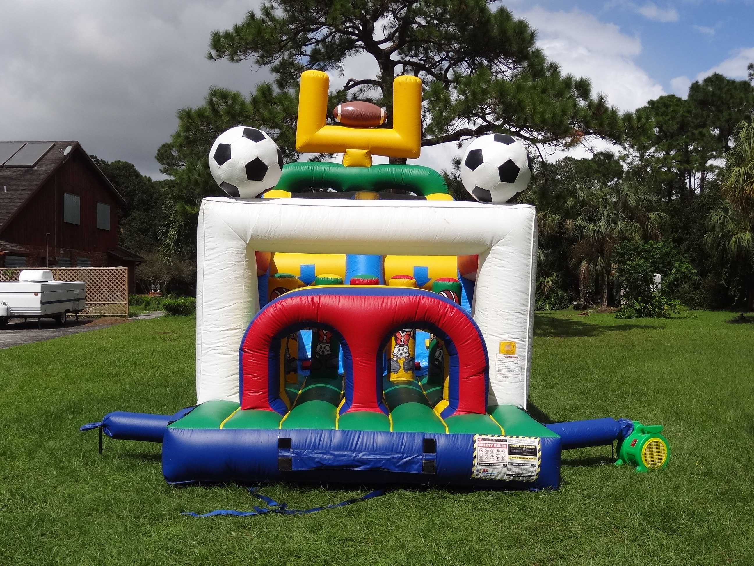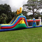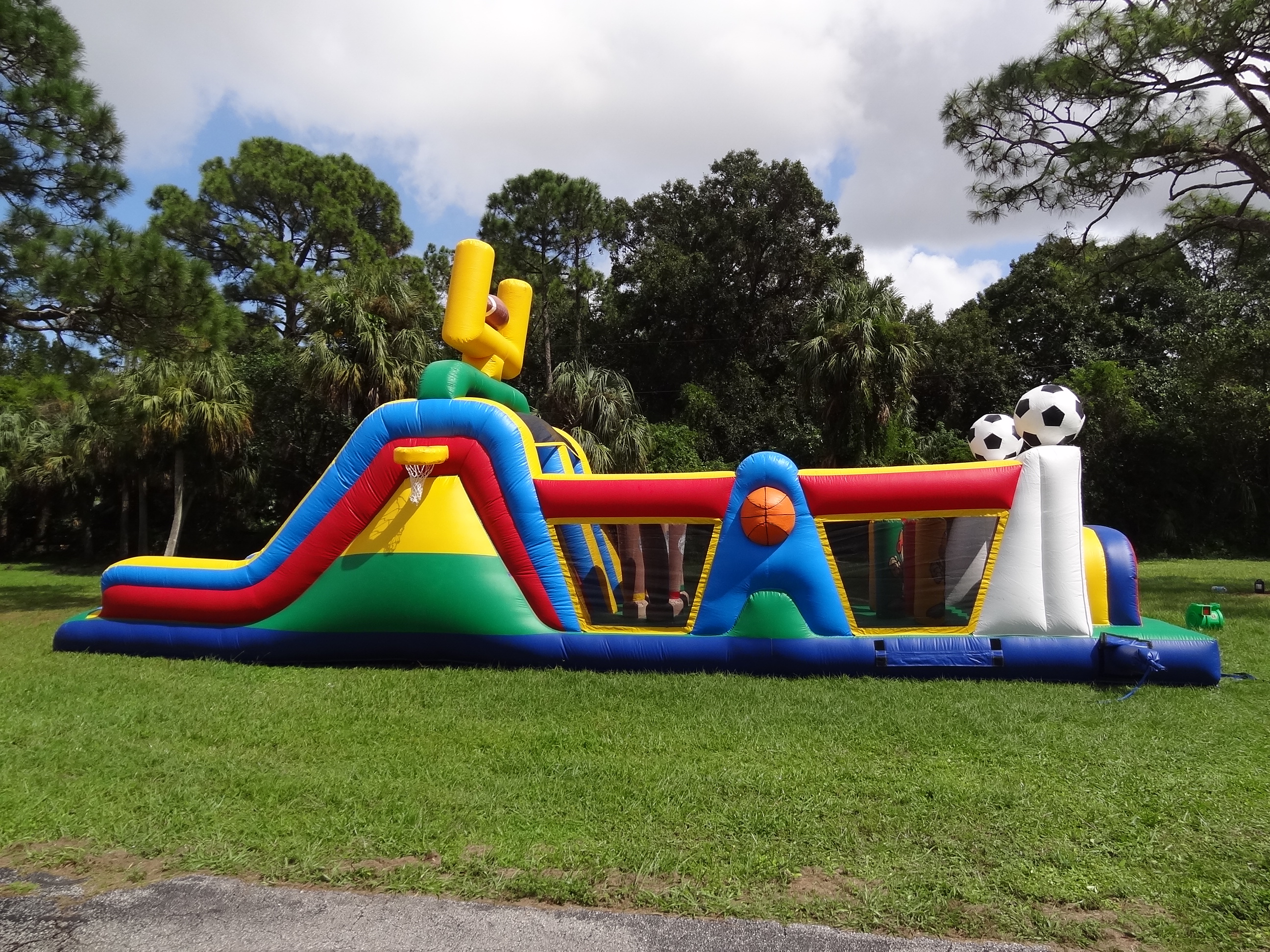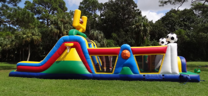 Backyard Sports Obstacle Course – This is one beautifully colored and designed obstacle course. It is forty feet long of fun and challenging obstacles. It is filled with horizontal/vertical pop ups. At the end of the course is a wall climb followed by a steep slide. This is perfect for those sports fanatic’s. We call it the Backyard Sports Obstacle Course because it is compact enough to fit small yards…..