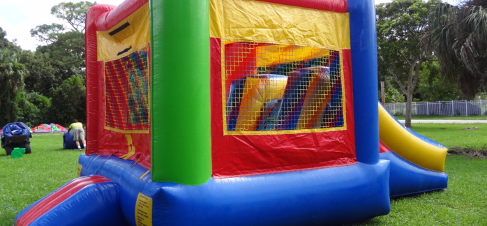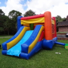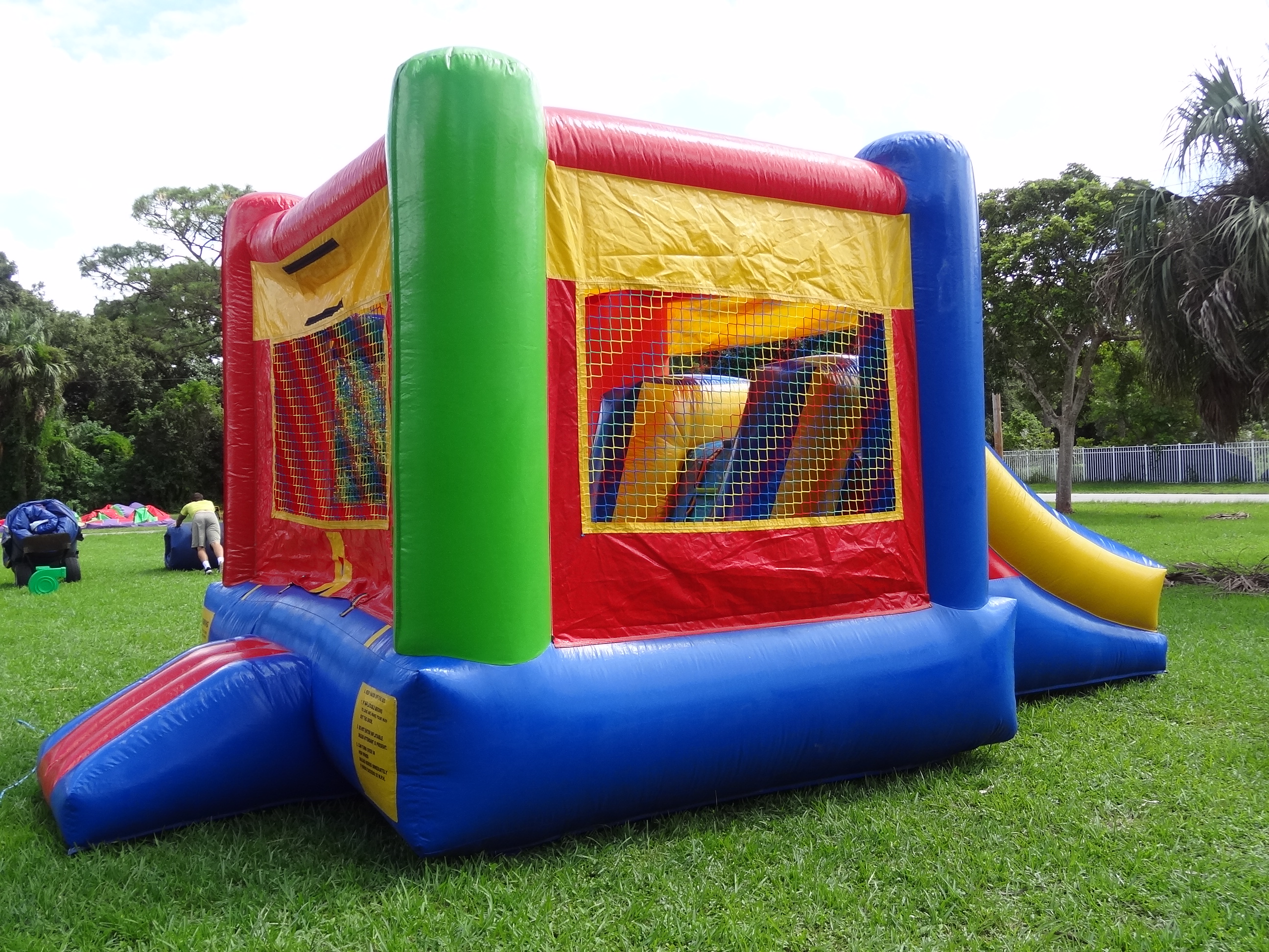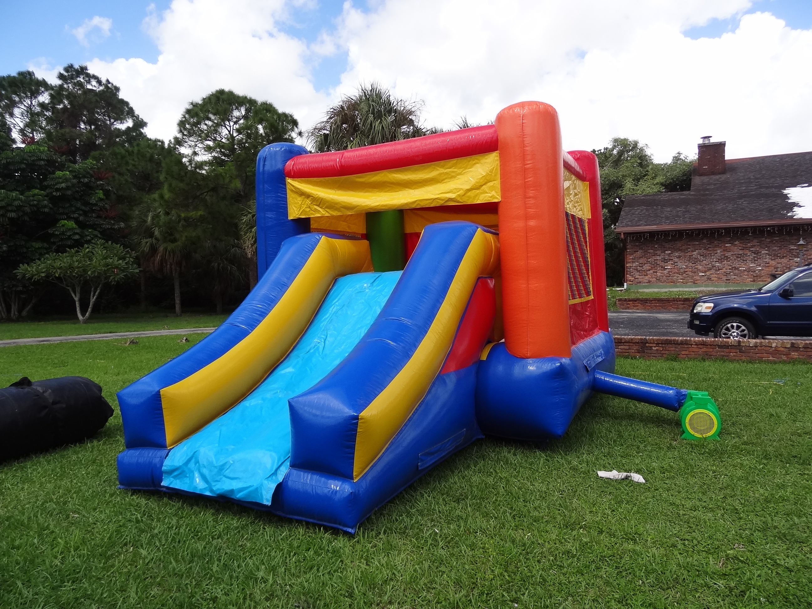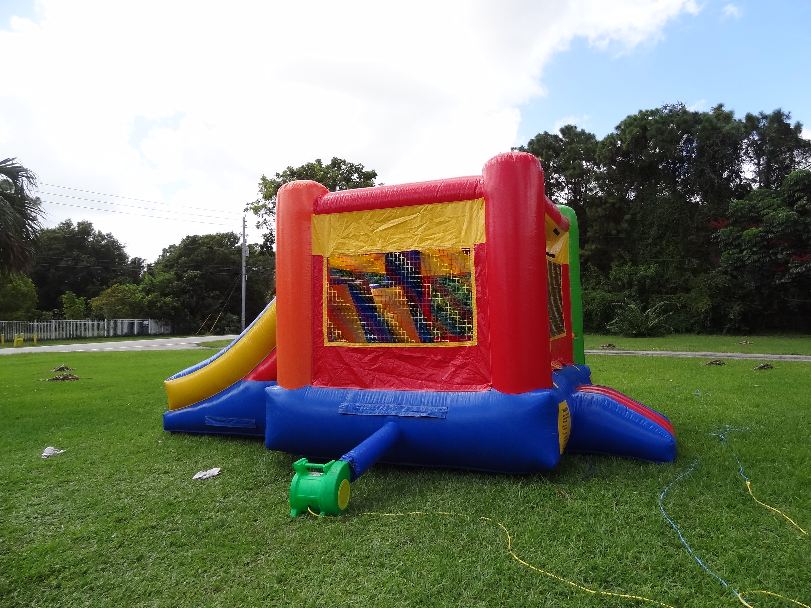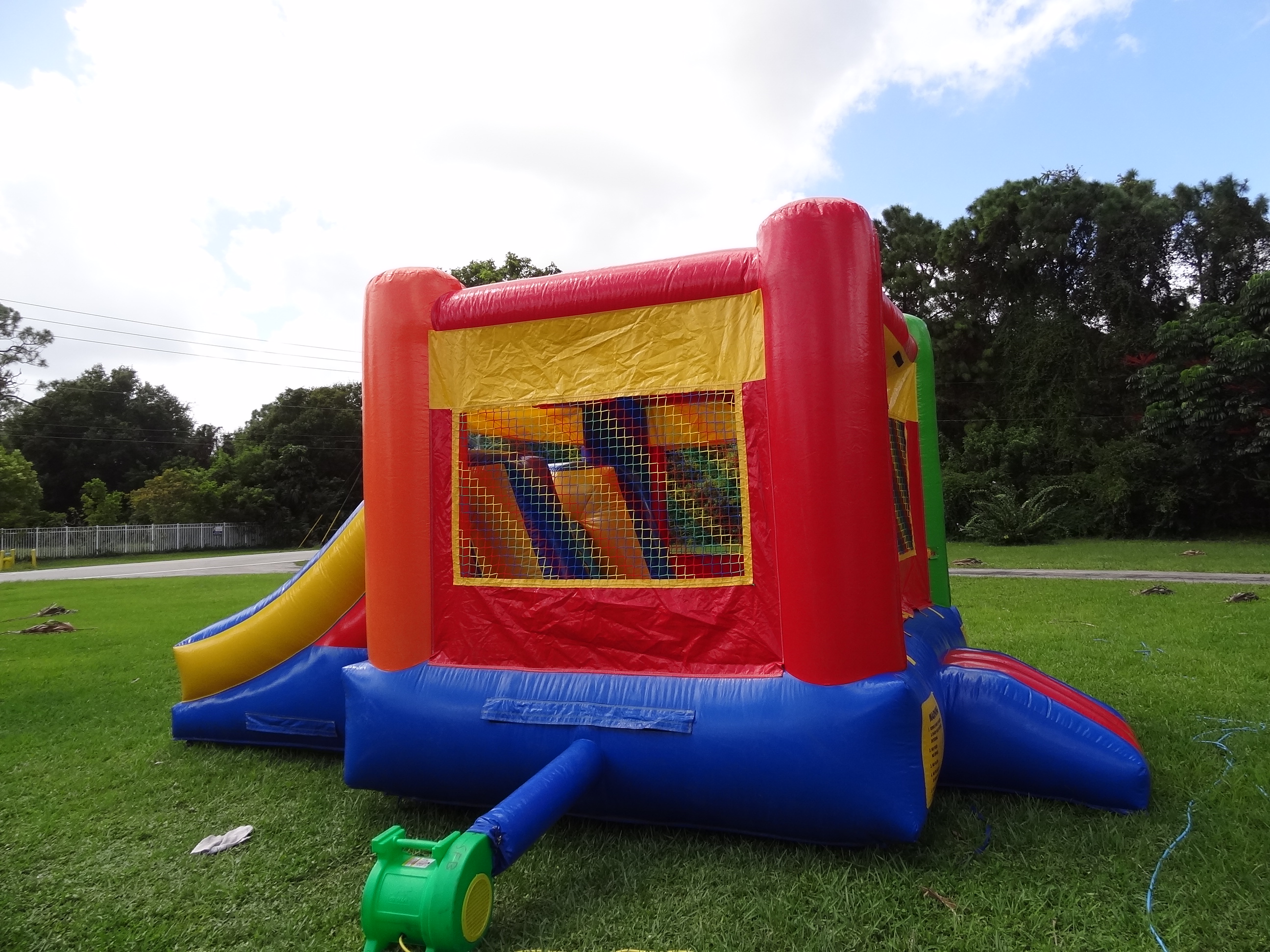 This combo unit is the ultimate party unit. The unit combines the fun of 4 different activities into one. It features 100 square feet of bounce area. Top that off with a climb up to a 8′ slide at a 50 degree sliding angle and you’ve got yourself a party full of fun. Also has a basketball net for shooting baskets. Great for smaller yards!