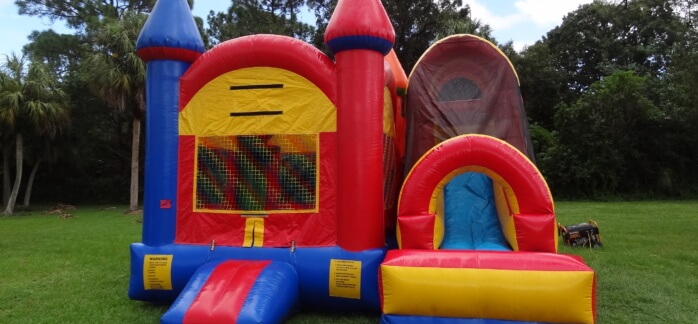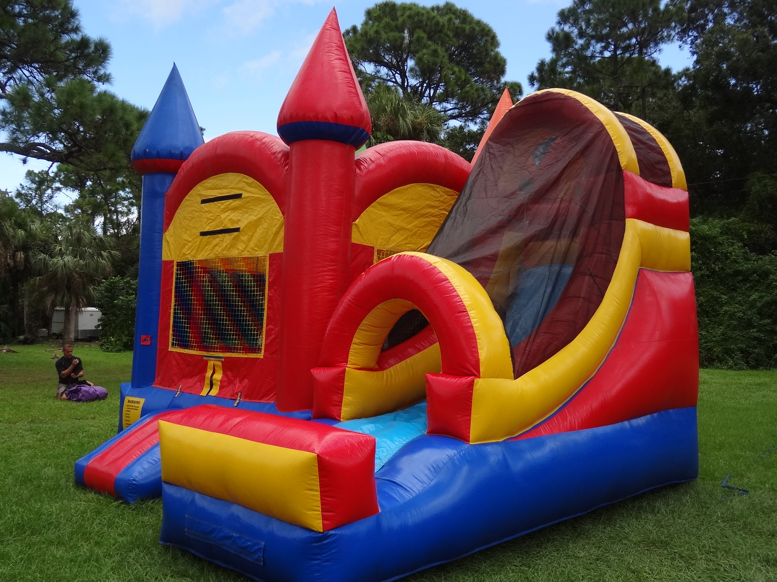 This combo unit is the ultimate party unit. The unit combines the fun of 4 different activities into one. It features 140 square feet of bounce area. Top that off with a climb up to a 15′ slide at a 50 degree sliding angle and you’ve got yourself a party full of fun. Also has a basketball net for shooting baskets.