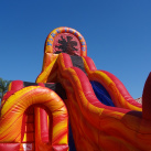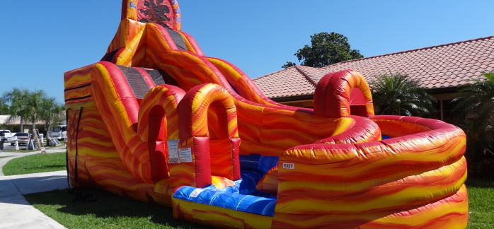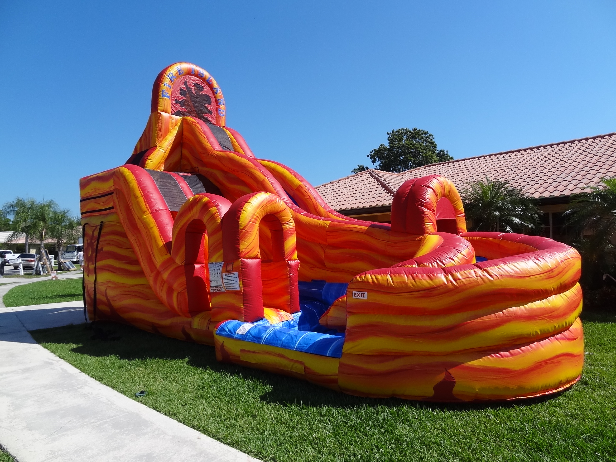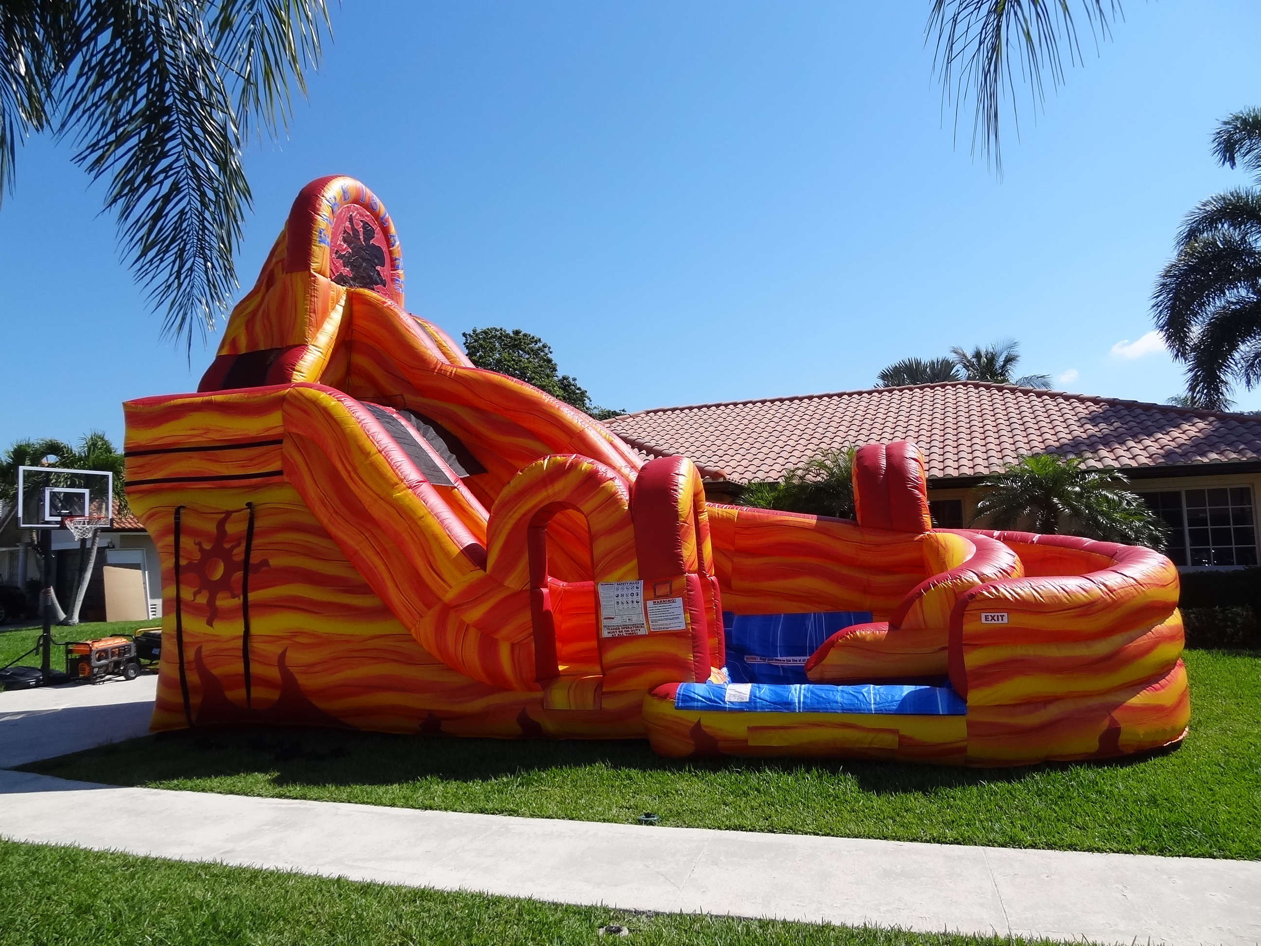 A volcano of 2-lane excitement! Take a plunge down our 25-foot-tall dual lane water slide. Climb the ladder and pick from sliding down the 15′ high platform straight slide or climb higher and plummet down the 20′ high platform with a cascading drop and a 90 degree turn into the pool. Great for all ages!