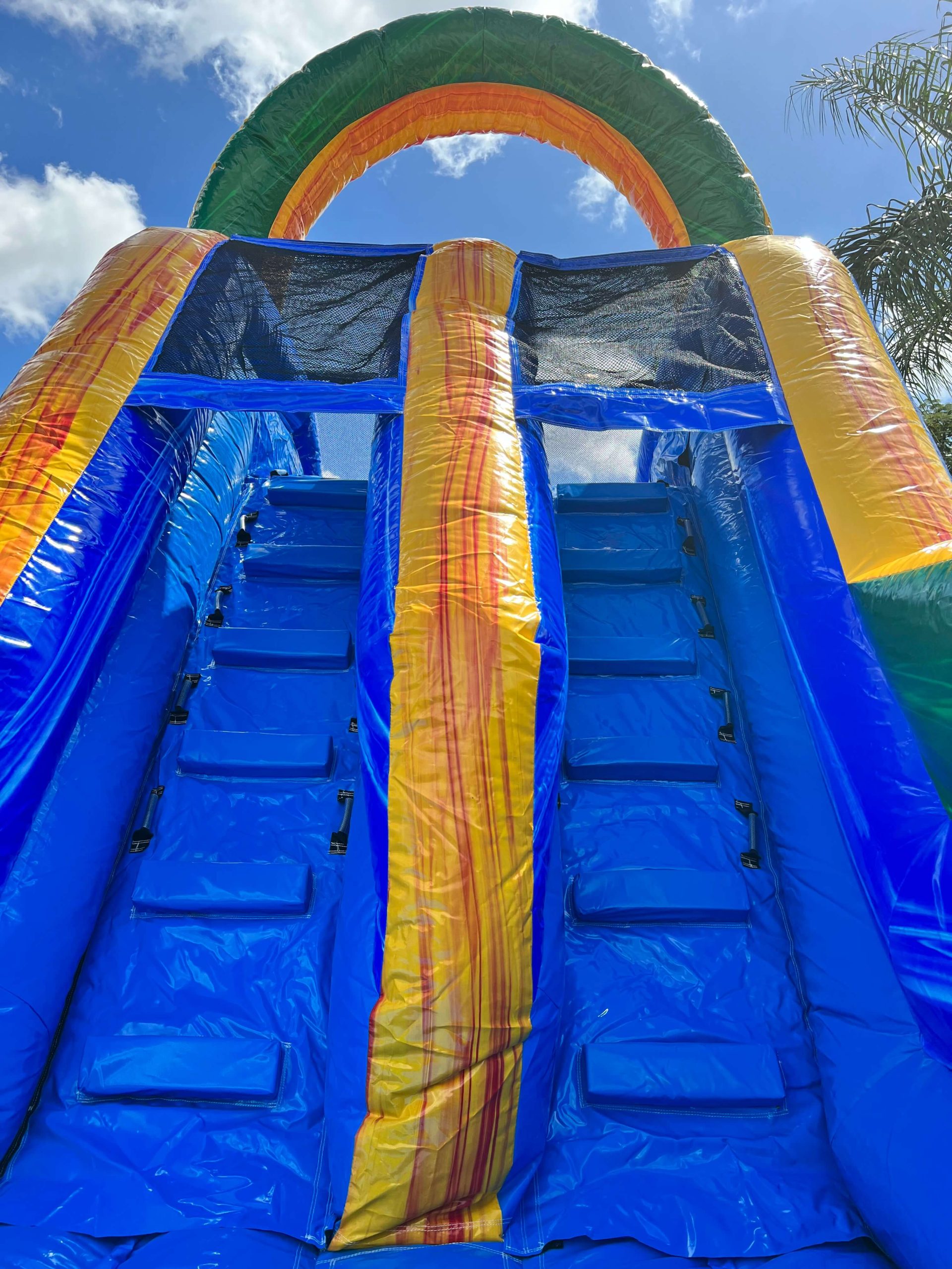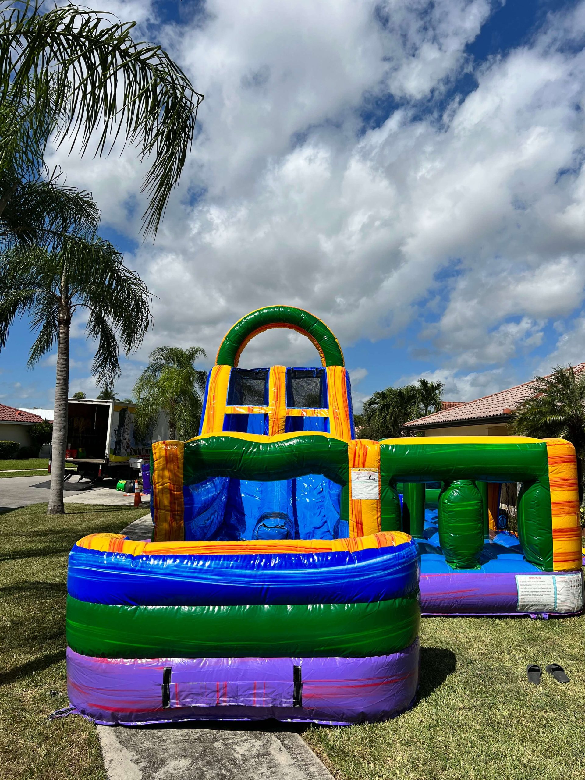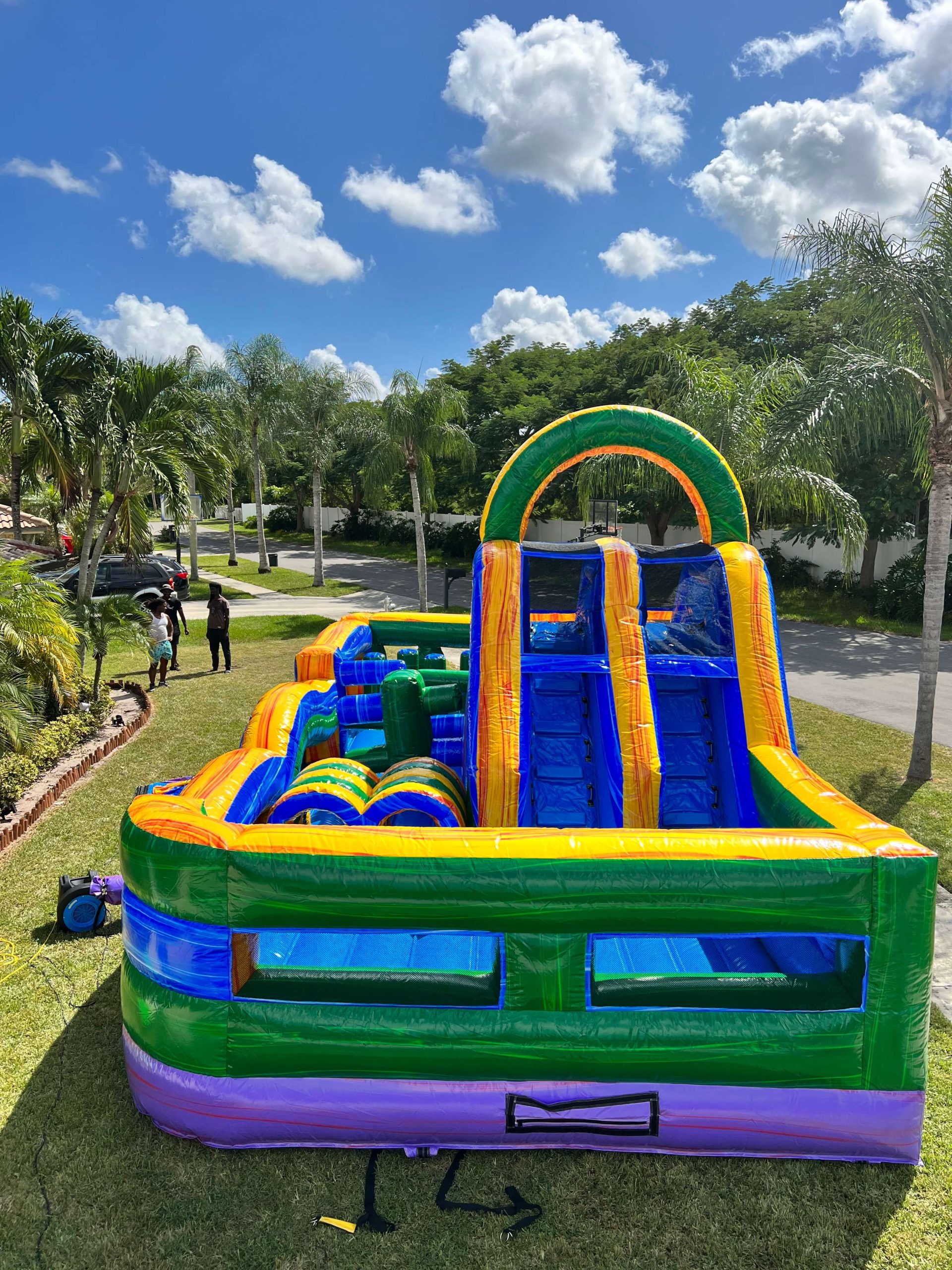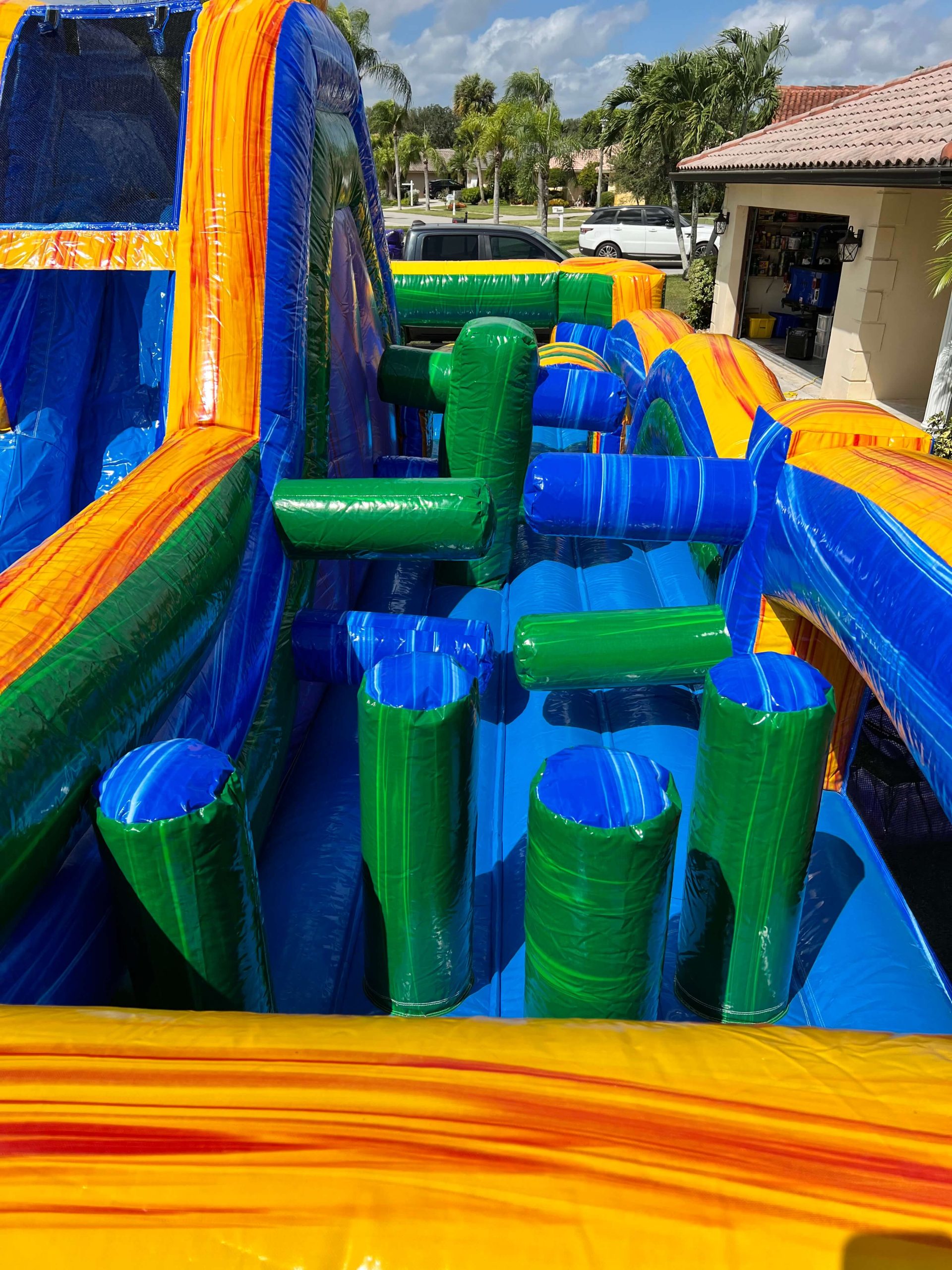 This wrap-around obstacle includes pop-ups, tunnels, and a large dual-lane slide. This unit also includes an attachable pool and bumper.