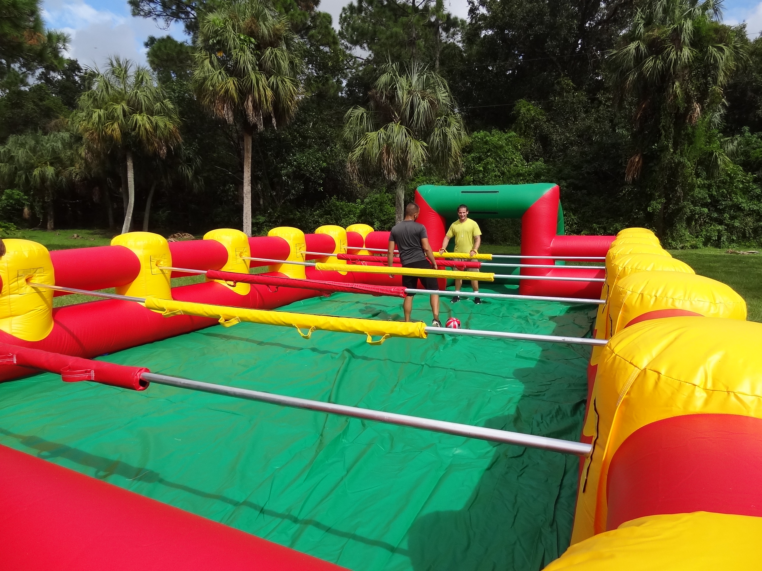 Best Game Ever, Get 10 of the guys (and gals) together and create your own life-sized foosball game inside the South Florida Bounce Inflatable Foosball Game. This inflatable game comes complete with flexible rods to “move” each player and two enclosed goals to keep the ball in play.