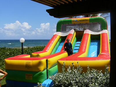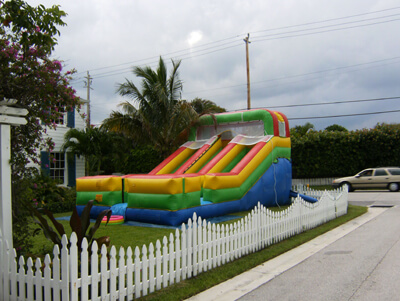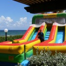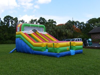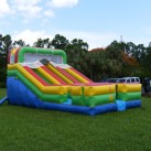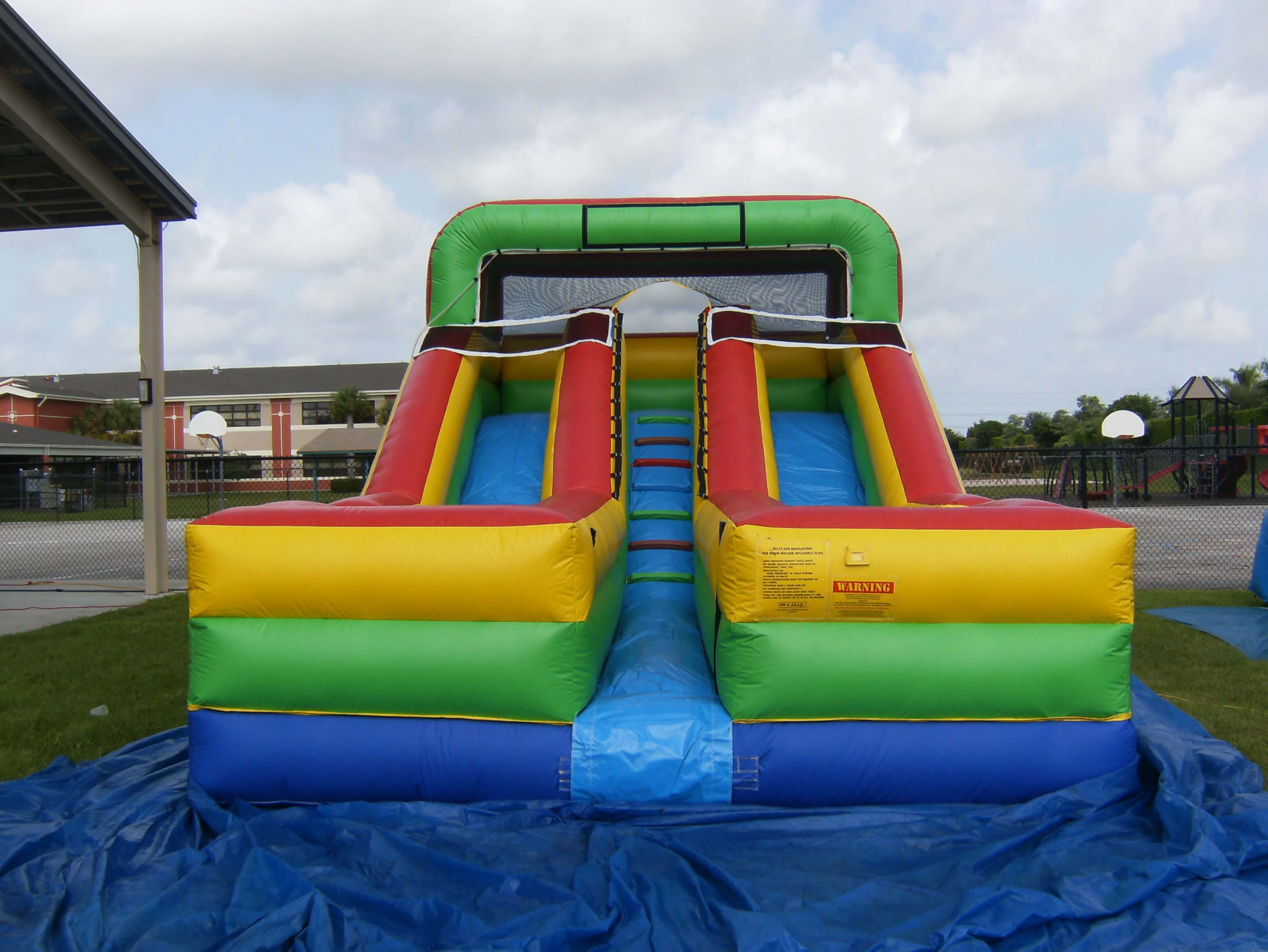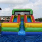 The impressive Dual Lane Lightning Storm slide is guaranteed to add tons of excitement and acceleration to any indoor or outdoor event. Great for promoting friendly competition or group challenges, kids can climb together up the center climb, and then choose a left- or right-sided slick slide, for a fast-track ride to the cushioned bottom with a safety stop. Hooded safety on the top makes sure riders slide down properly. The bright and colorful theme fits into any decor, sure to attract customers for a thrill-filling day, and keep the kids sliding!