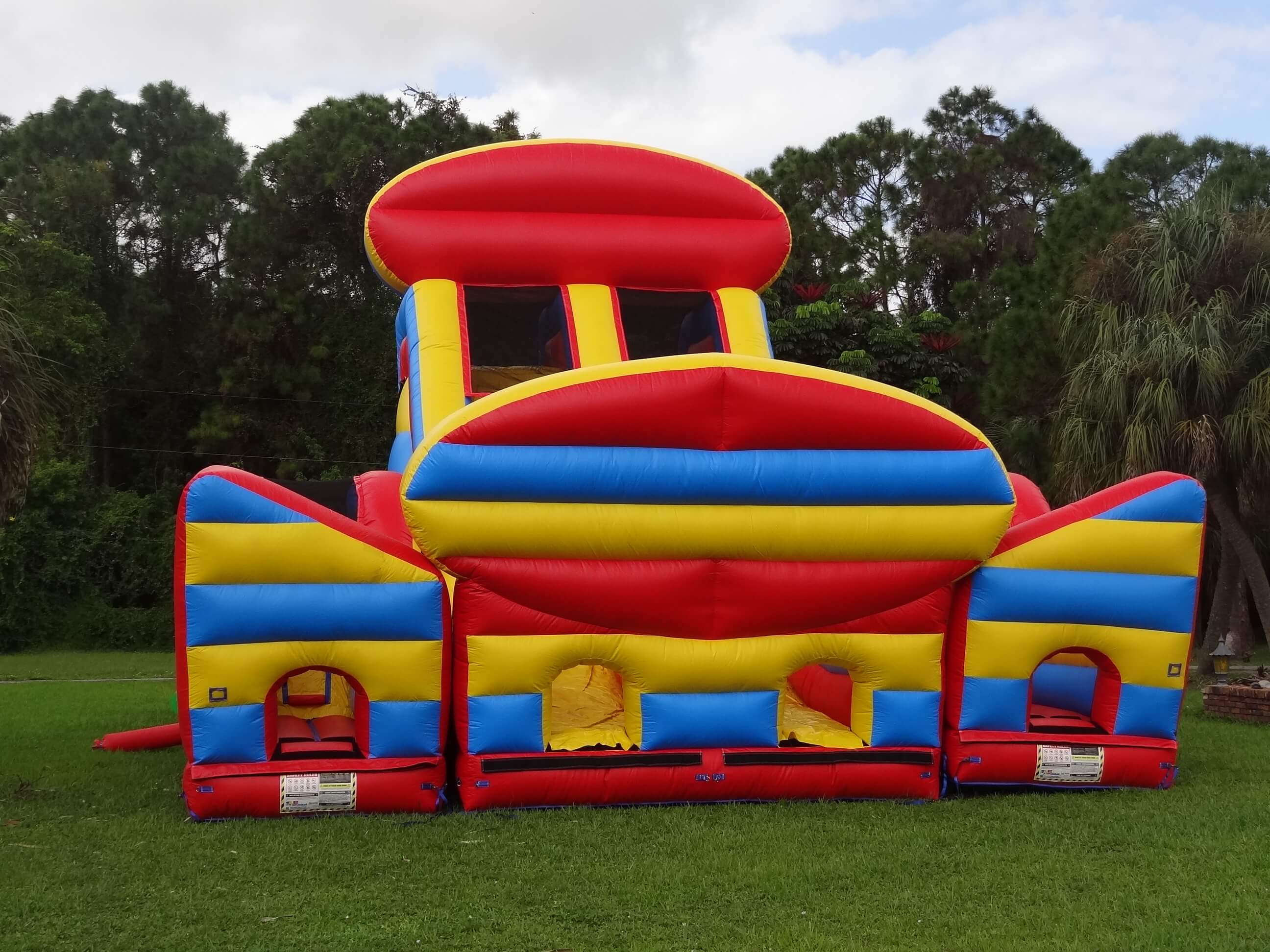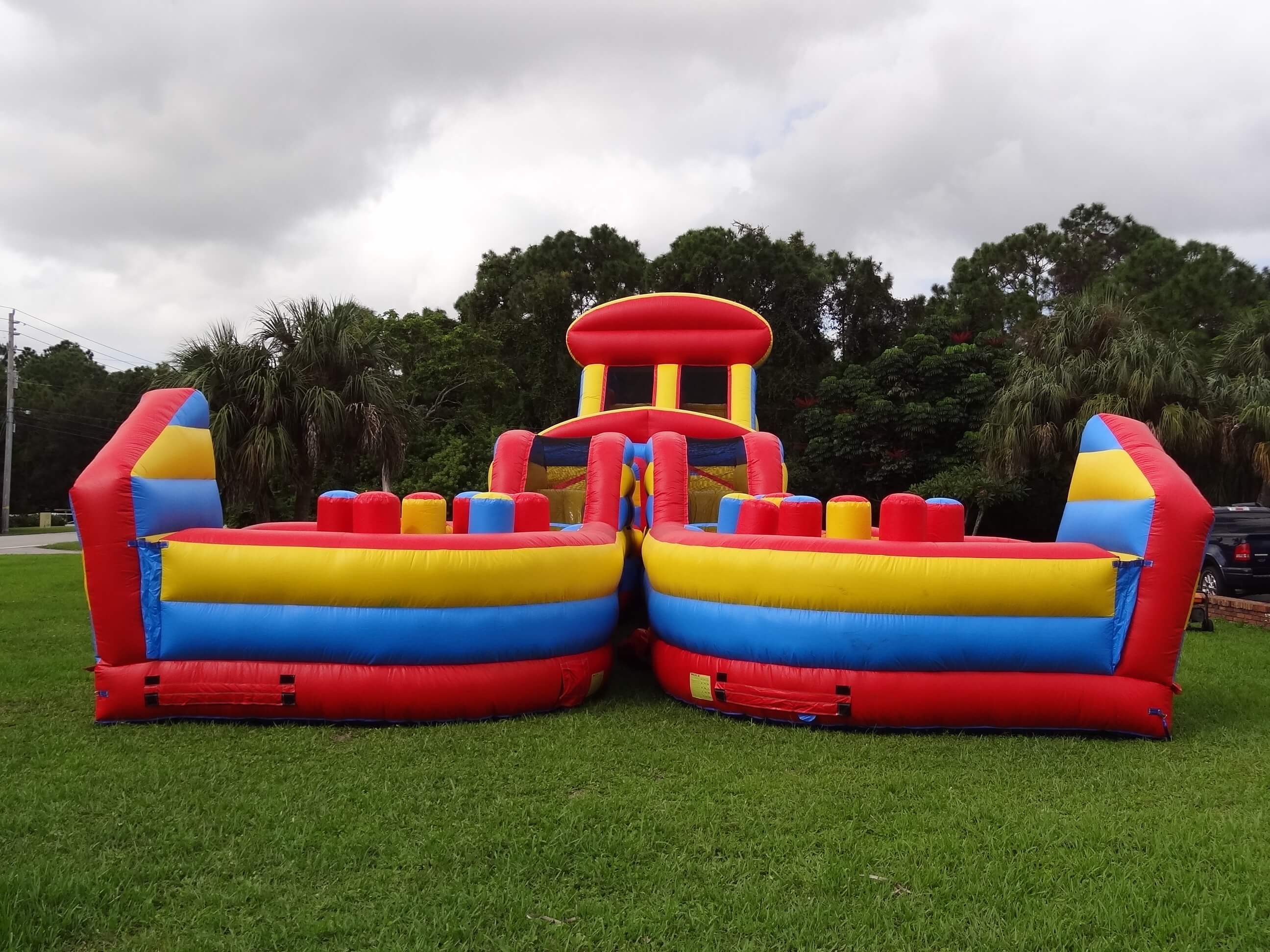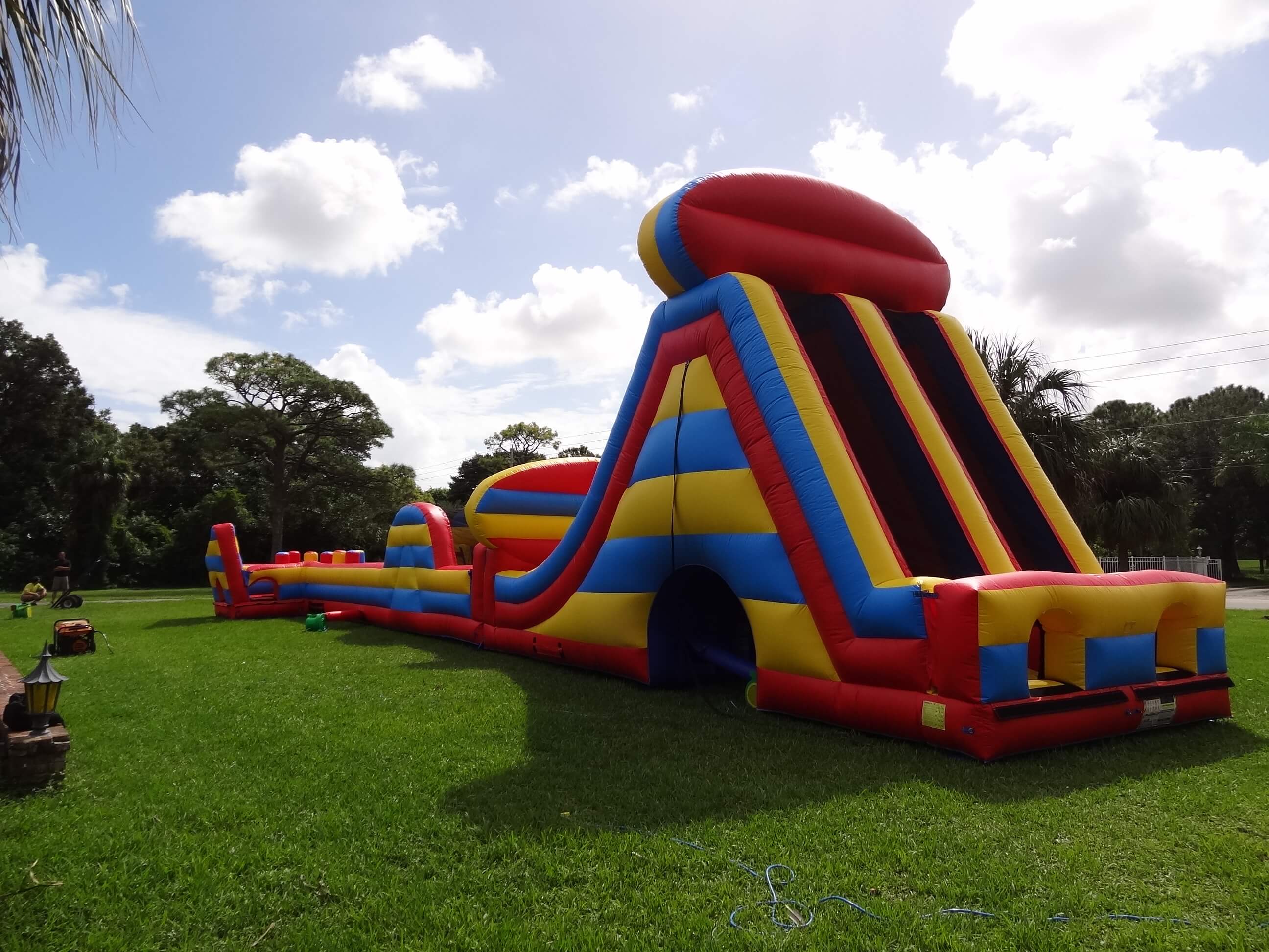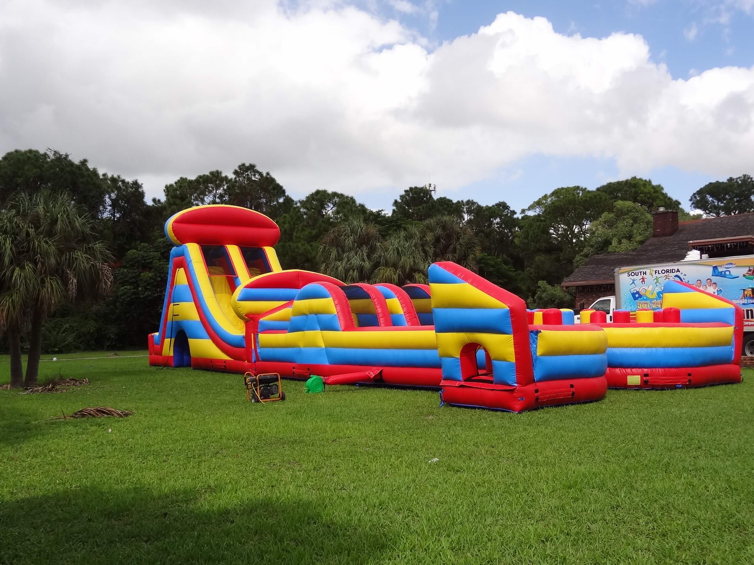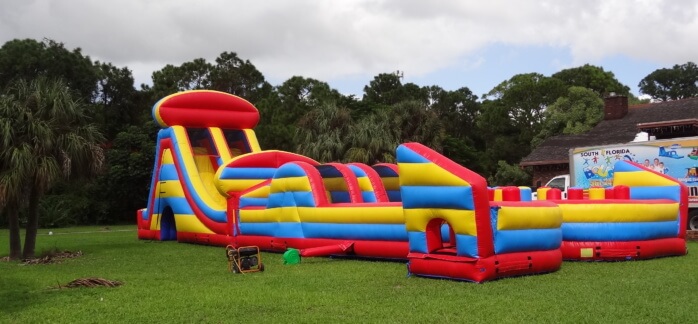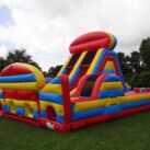 This monster is 90 FEET LONG and is guaranteed to make you huff and puff by the end of it. The course offers a series of obstacles that are designed to challenge even the most fit individuals. From running and climbing to jumping and sliding, participants will get it all on this course. Can be setup side by side (45L x 35W x 25H) or also set up long (90L x 25W x 25H)”Take on the ultimate challenge with the **Radical Run Obstacle Course** from South Florida Bounce, featuring a massive 25-foot tall slide! This action-packed inflatable obstacle course is loaded with tunnels, climbing walls, and a towering slide that promises an adrenaline-pumping experience. Perfect for kids’ parties, summer camps, school events, corporate team-building, and festivals, this course offers excitement for all ages. Available for rent in cities like West Palm Beach, Boca Raton, Fort Lauderdale, Miami, Coral Gables, Hobe Sound, and Stuart. Serving Palm Beach, Broward, Miami-Dade, and Martin counties, the **Radical Run Obstacle Course** is guaranteed to make your next event unforgettable. Book now and get ready for a high-flying adventure!”