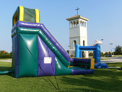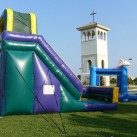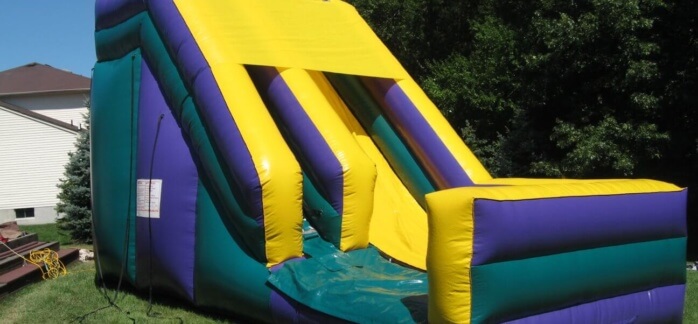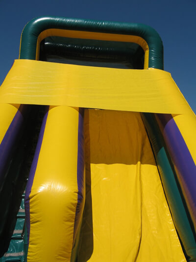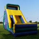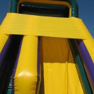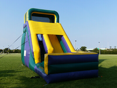 This attention-getting slide is sure to bring everyone running and keep them sliding at your next event! Participants can climb up 18 feet for a sleek and fast drop to the cushioned bottom, guaranteed to satisfy thrill seekers young and old. With a colorful purple, green and yellow theme, this slide will match any theme or decor, and be an eye-catching attraction. Riders will enter the left side of the inflatable play structure and make the climb and slide down the right side of the slide and exit on the right, ready to run around for a second turn.