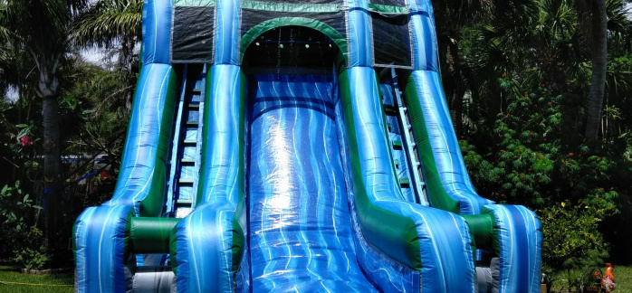 You will surely get every ones attention and bring them running when you have this set up at your next event. Easily climb up 22 feet for a sleek and fast drop into your pool, guaranteed to satisfy thrill seekers young and old. Enjoy the two types of climbing, one side is a rock climb and other is a ladder climb to find yourself ready to slide down this ultimate thrill ride. With a colorful theme, this water slide will match any theme or decor, and be an eye-catching attraction. Sure to be fun for all ages!