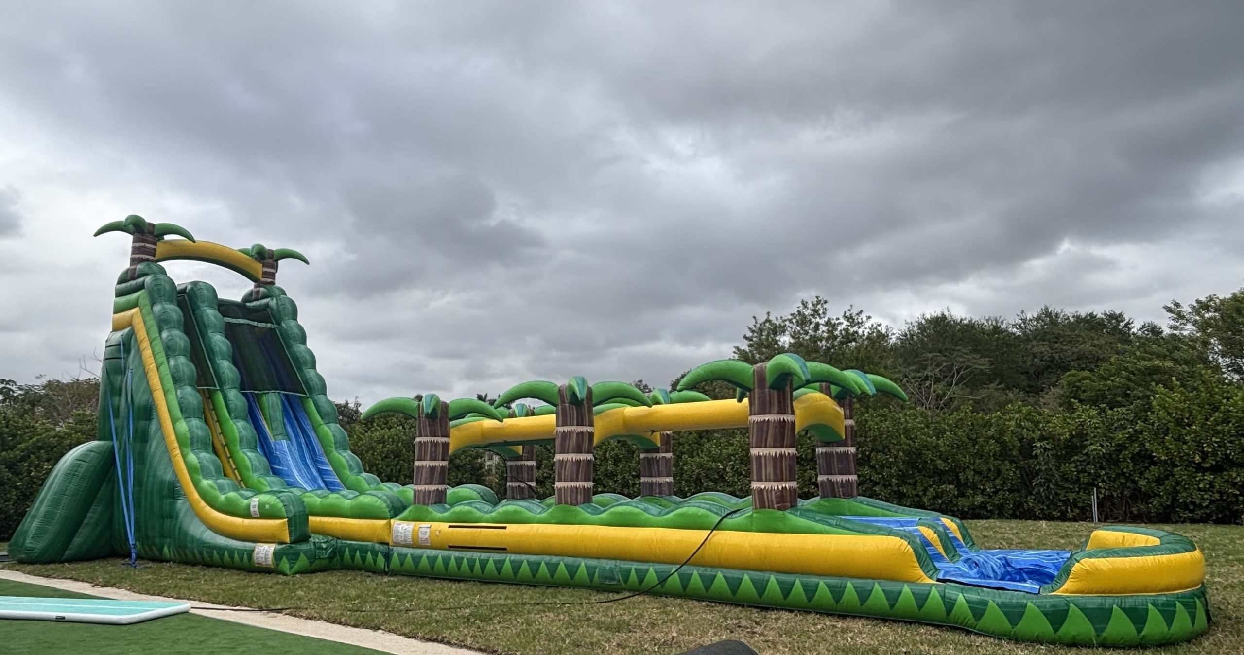 Prepare for a wild ride with the Tropical Storm Water Slide 32ft DL! This towering inflatable is perfect for any summer event, featuring a 32-foot drop that will have you screaming with excitement as you splash down into the refreshing pool below. Perfect for large parties, the vibrant tropical theme creates an island vibe right in your backyard. Get ready to cool off and have a blast!