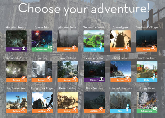 Includes several scenarios such as children, adventure, action, horror and sci-fi. The roller coaster simulator reaches speeds up to 90 mph depending on the scenario and the car vibrates as you go round the bends. Pure adrenaline and total immersion!